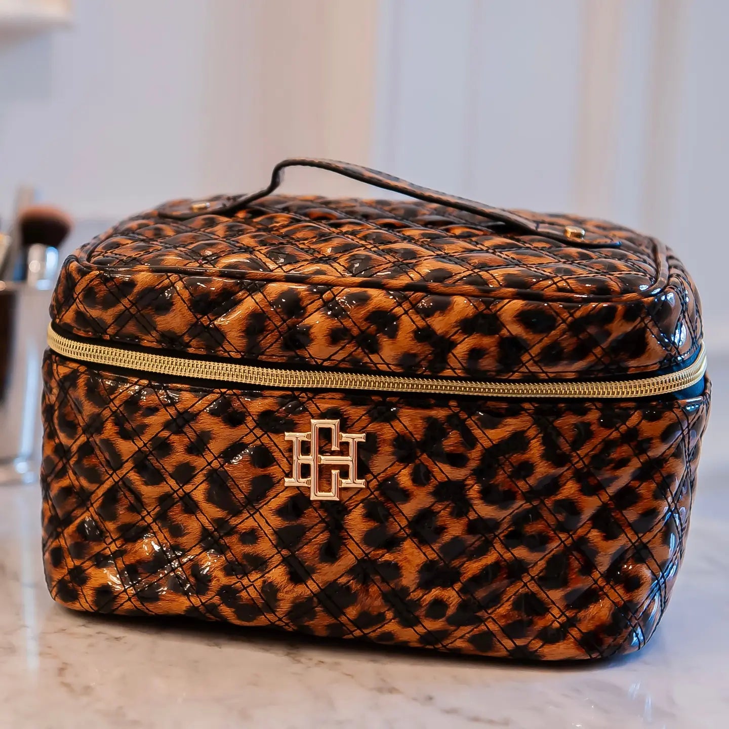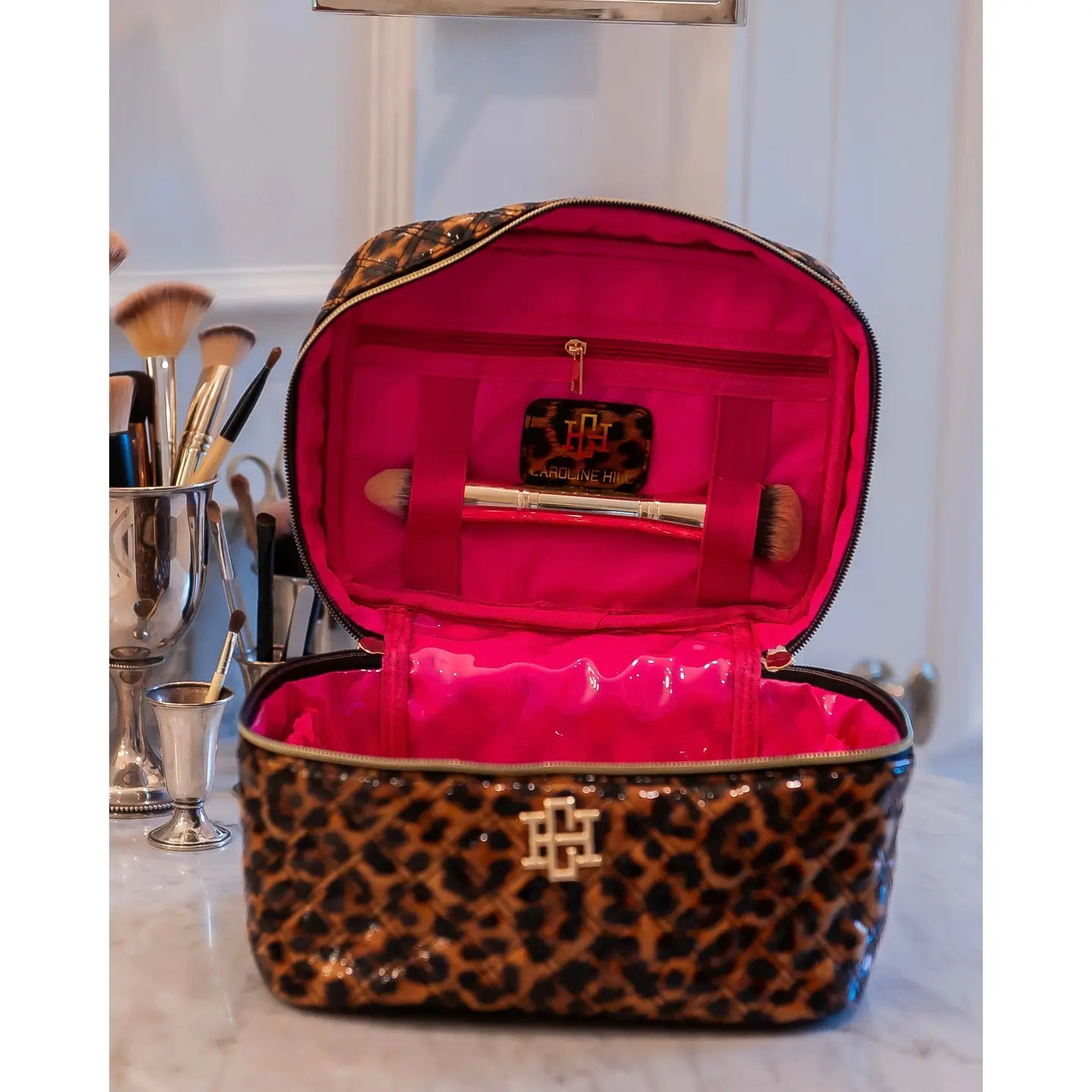 This stylish and functional vegan patent leather train case is part of our makeup and travel collection. It features a sleek quilted fabric design and a top carrying handle. The wide zipper closure provides easy access, making it perfect for organizing makeup, toiletries, and hair accessories. The spacious interior is lined with hot pink with a clear protective fabric that is easily wipeable. The top of the train case has a zippered pouch and elastic holders for brushes, lipsticks, and more. The body of the case has two elastic pockets for added organization.