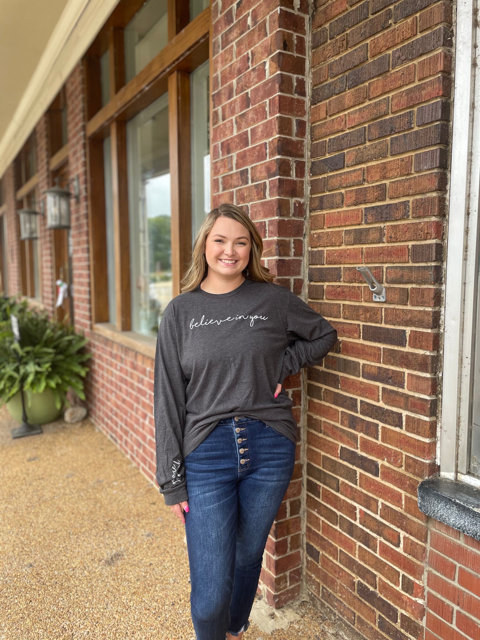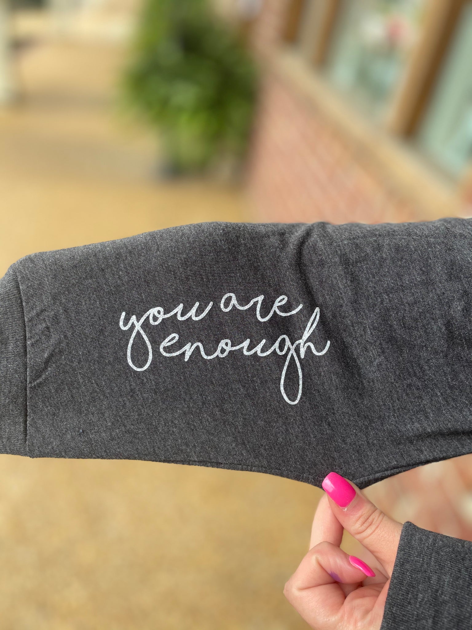 Gray Bella Canvas Round Neck Shirt with "Believe in You" in White across the chest and "You Are Enough" on the right sleeve