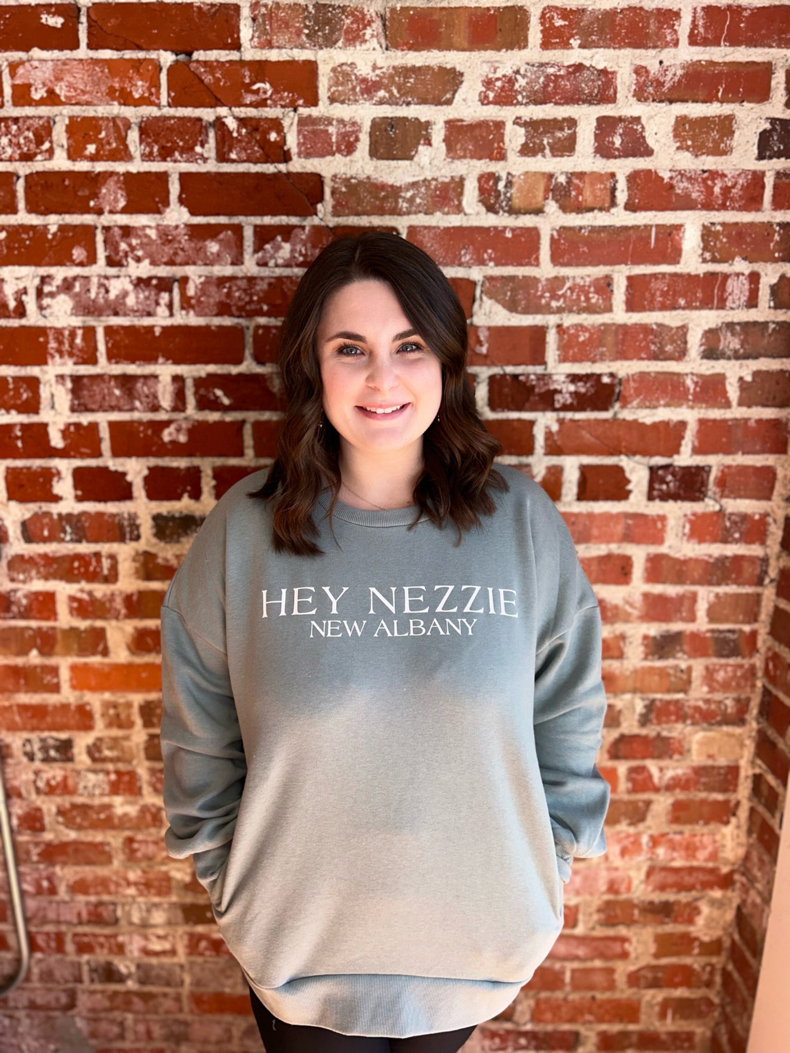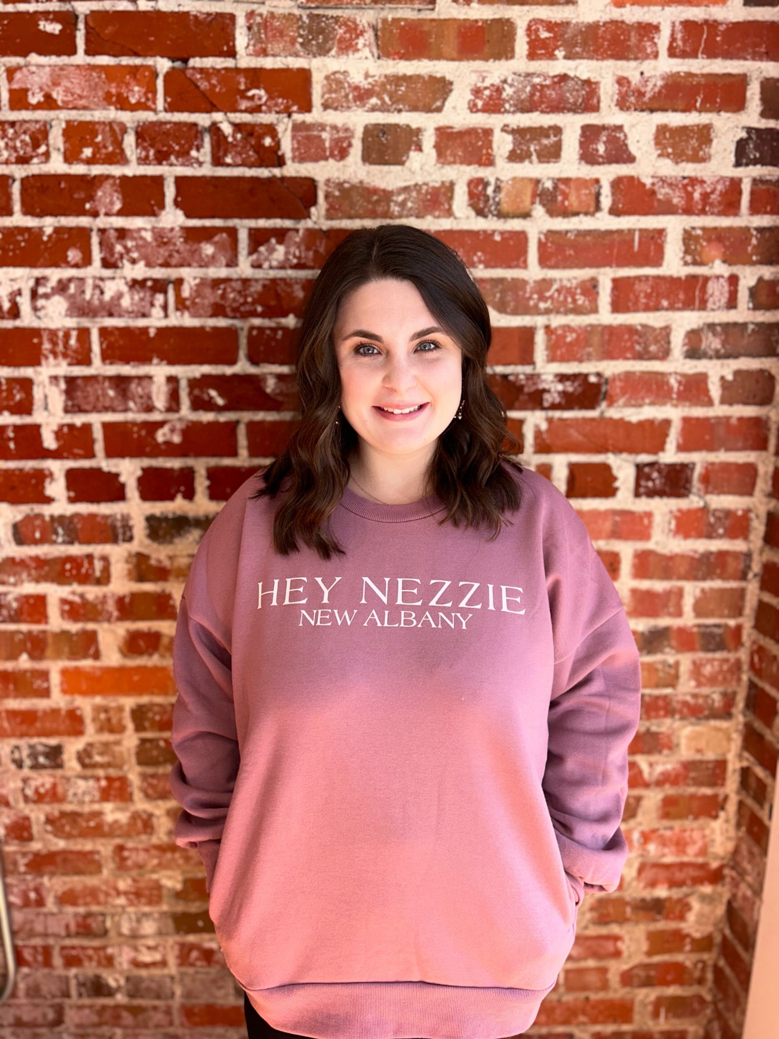 Hey Nezzie Boutique Sweatshirt. Available in Mauve, Lilac, Jade, and Ash Green.