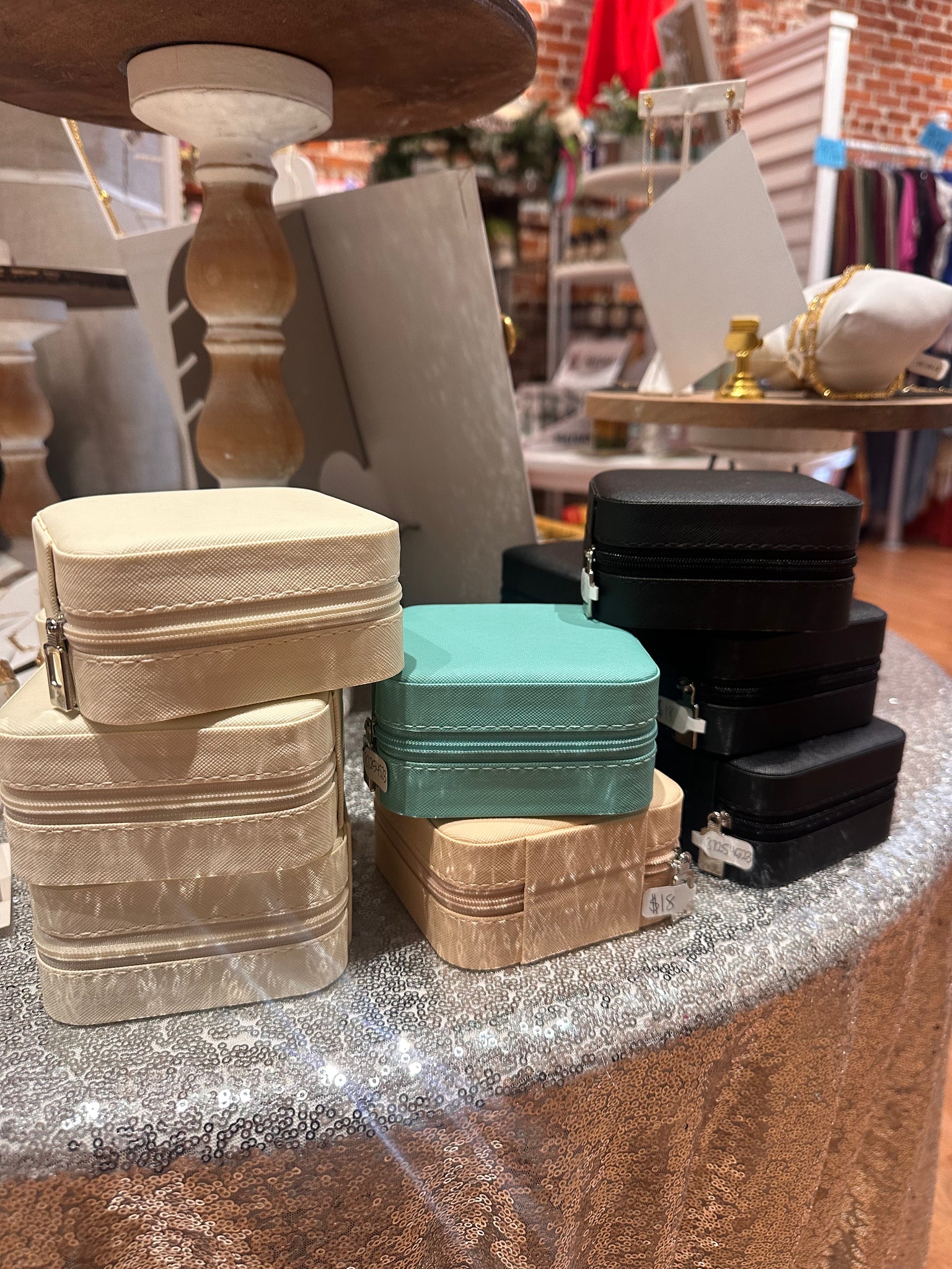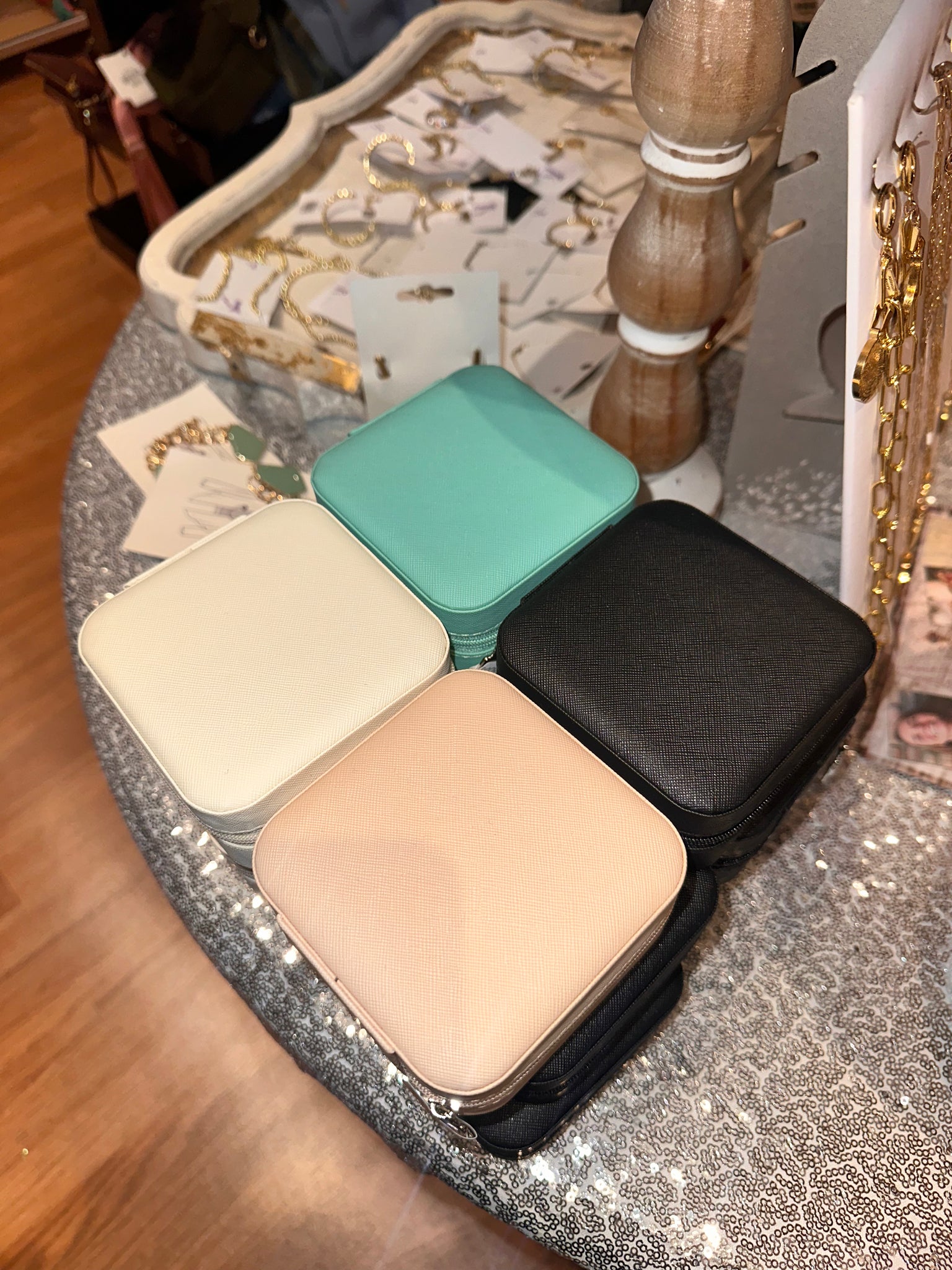 Leather, Portable Travel Jewelry Box available in Black, Blue, Pink, and Cream.