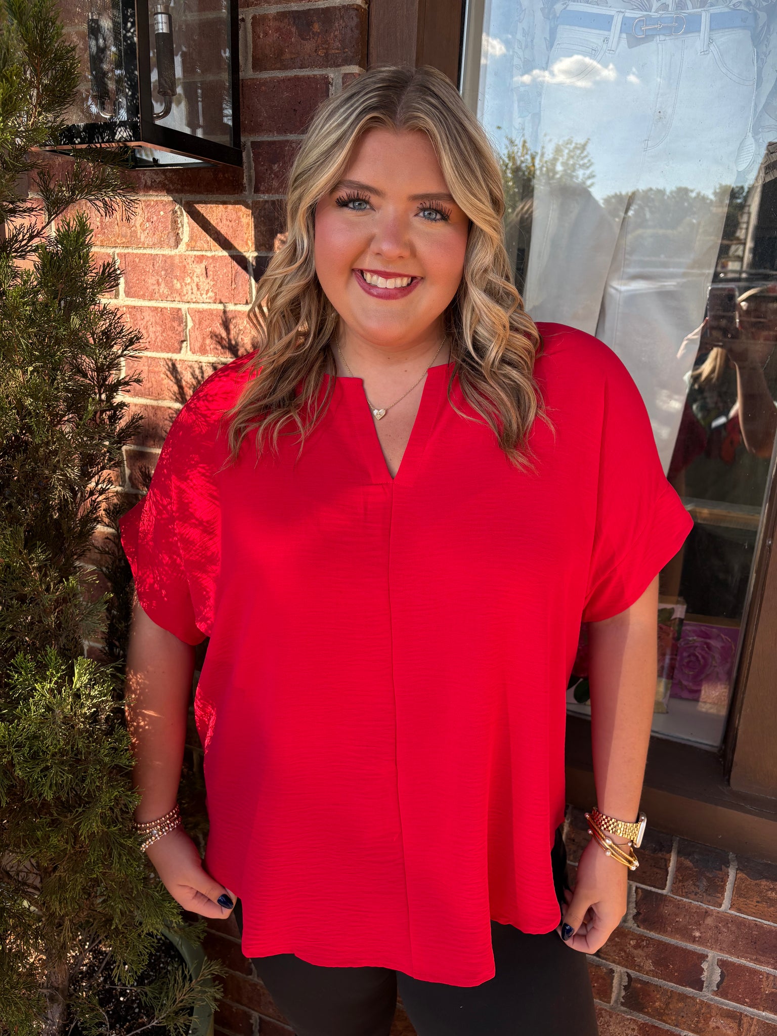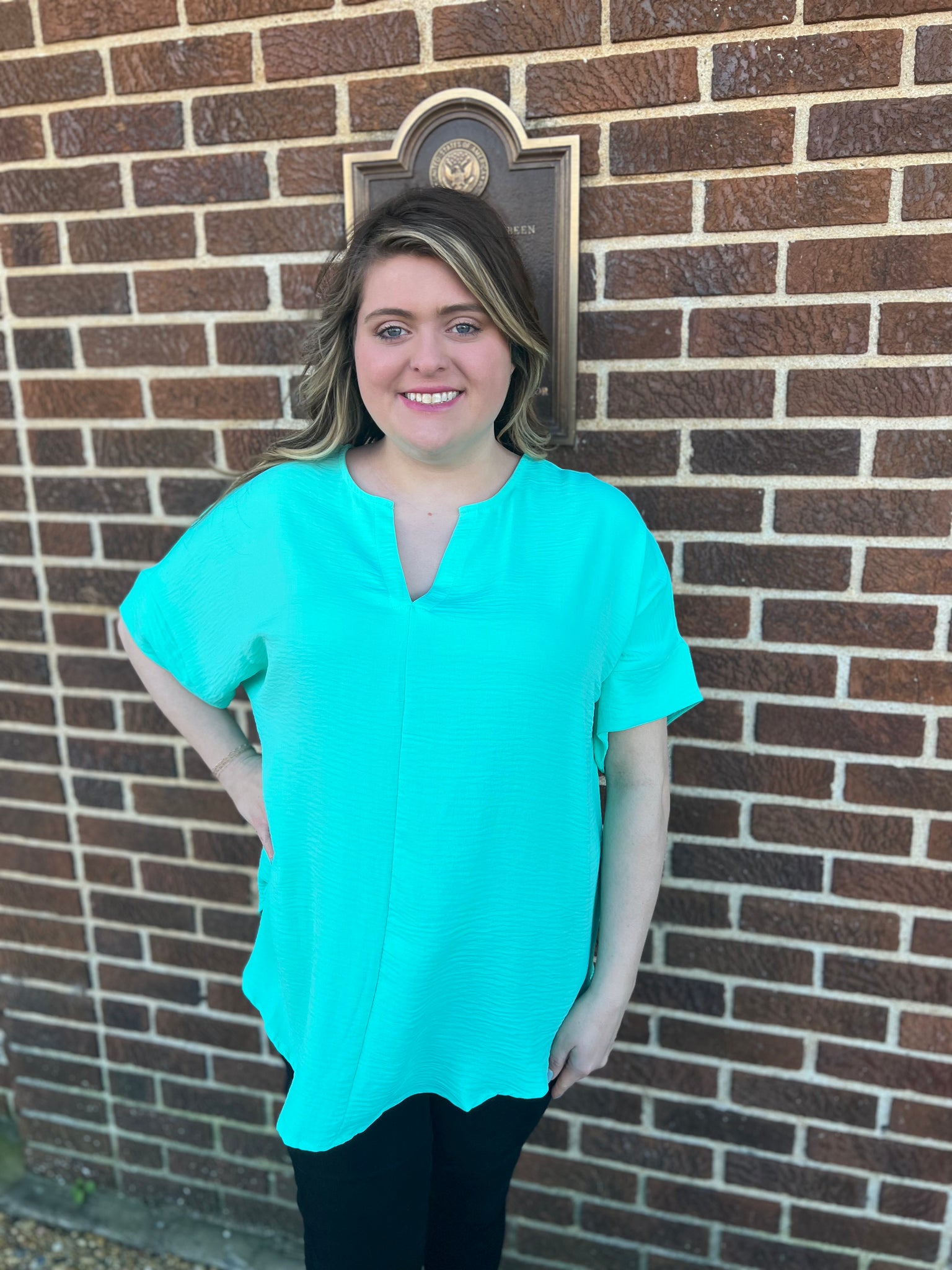 Woven Airflow Split Neck Short Sleeve Top. Comes in new fall colors: Ash Jade, Ash Mocha, and Ruby